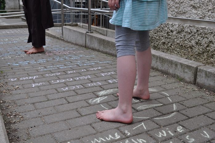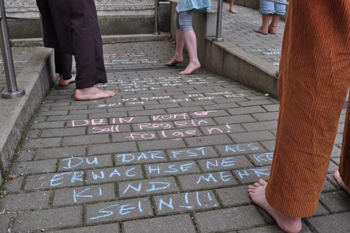 „Wenn man das so alles aufgeschrieben sieht, wird einem erst bewusst, wie viel es ist“, so eine Grundschülerin im anschließenden Gespräch. Ein Teilnehmer ergänzt: „Und das hier auf dem Boden ist ja nur ein kleiner Bruchteil davon.“ Im Anschluss überlegte die Gruppe, wie man die jeweiligen Regeln brechen kann und was es bedeuten würde, sie zu brechen.