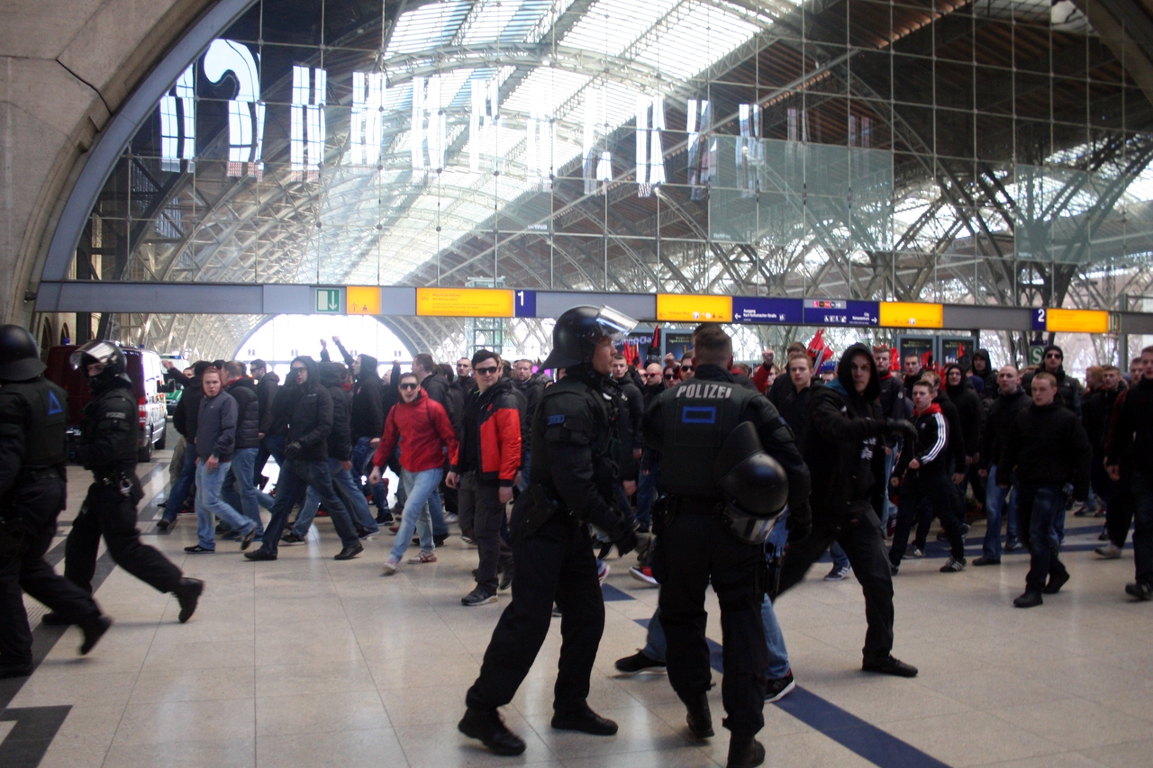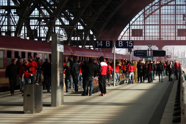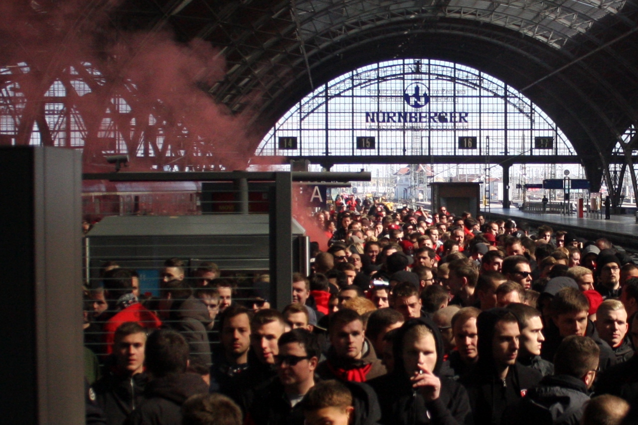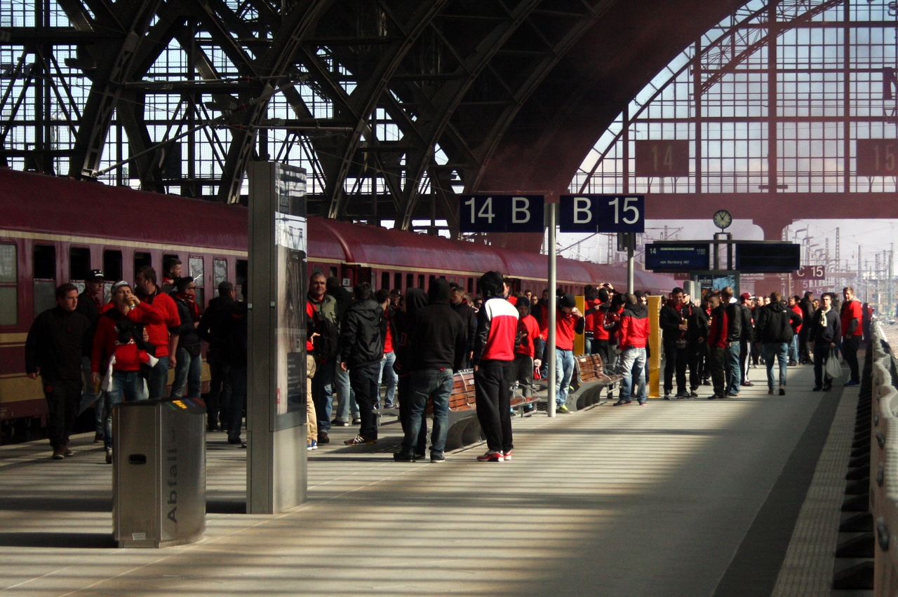 Zwei Redakteure der L-IZ waren am Sonntag bei der Ankunft des Sonderzugs der Nürnberger Ultra-Szene am Leipziger Hauptbahnhof zugegen. Kaum hatten die ersten Fans Bahnsteig 14 betreten, explodierte der erste Kanonenschlag. Roter Rauch stieg empor. Ein FCN-Fan bedrohte einen Pressefotografen. Auf dem Weg zu den 13 Shuttle-Bussen, die in der Kurt-Schumacher-Straße warteten, lieferten sich einzelne Ultras Rangeleien mit der Polizei. Eine gefüllte Bierdose flog durch die Luft.