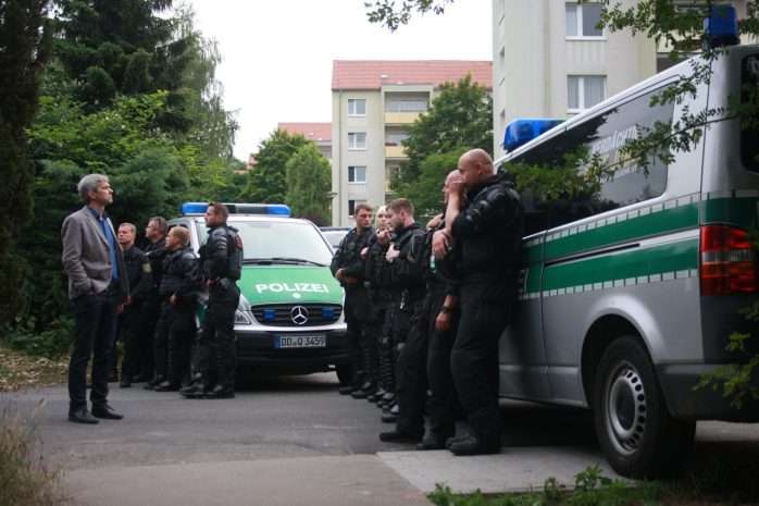 Die Polizei musste bei den Protesten regelmäßig vor Ort sein. Der Leipziger Bus erhielt konsequente Polizeibegleitung durch die komplette Stadt. Pressesprecher Thomas Geithner sprach von 120 Beamten in der vergangen Woche. 50 Weitere wurden am Freitagabend zusätzlich bereitgestellt, um die Lage abzusichern. Erneute Übergriffe konnte die Polizei irritierenderweise auch an diesem Abend wieder nicht verhindern. Den Geruch von Selbstjustiz in der Stadt ebenfalls nicht.