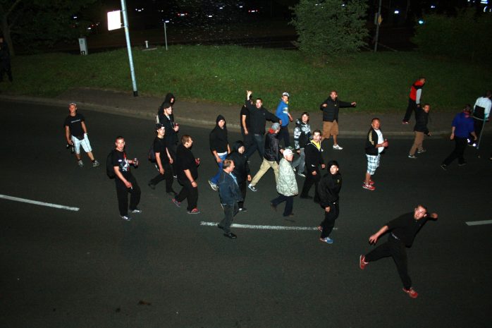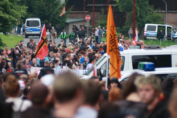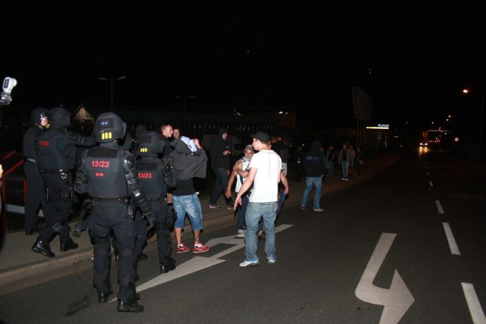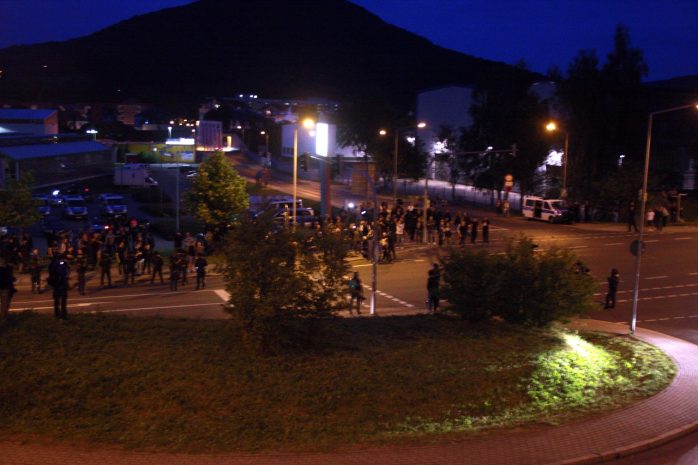 Man zeigte sich gewohnt gewaltbereit, auch untereinander gingen die Fäuste um. Zwei Gewahrsamnahmen musste Polizeisprecher Geithner vermelden. „Nein zum Heim“-Ordner waren durch die stark alkoholisierten Teilnehmer der eigenen Demonstration angegriffen worden. Offiziell äußerte sich die Polizei nicht zur Aggressivität der Teilnehmer. Aus anderen Quellen war zu erfahren, dass sie als äußert gewaltbereit eingeschätzt wurden – „Kategorie Rot.“