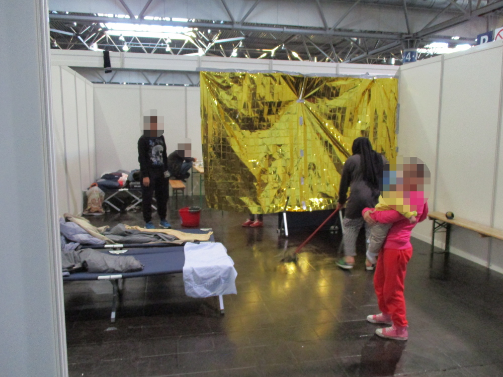 Kim Schönberg vom Initiativkreis erklärt dazu: „Die Zustände in der Messehalle 4 sind menschenunwürdig, ja menschenrechtswidrig“ und zitiert die Frage eines Flüchtlings „I am an animal?“ („Bin ich ein Tier?“). Für besonders problematisch hält er die aus der Lage resultierende Isolation und sieht das Recht der Untergebrachten auf gesellschaftliche Teilhabe als verwehrt an, weil grundlegende Leistungen nicht ausgeschüttet werden würden.