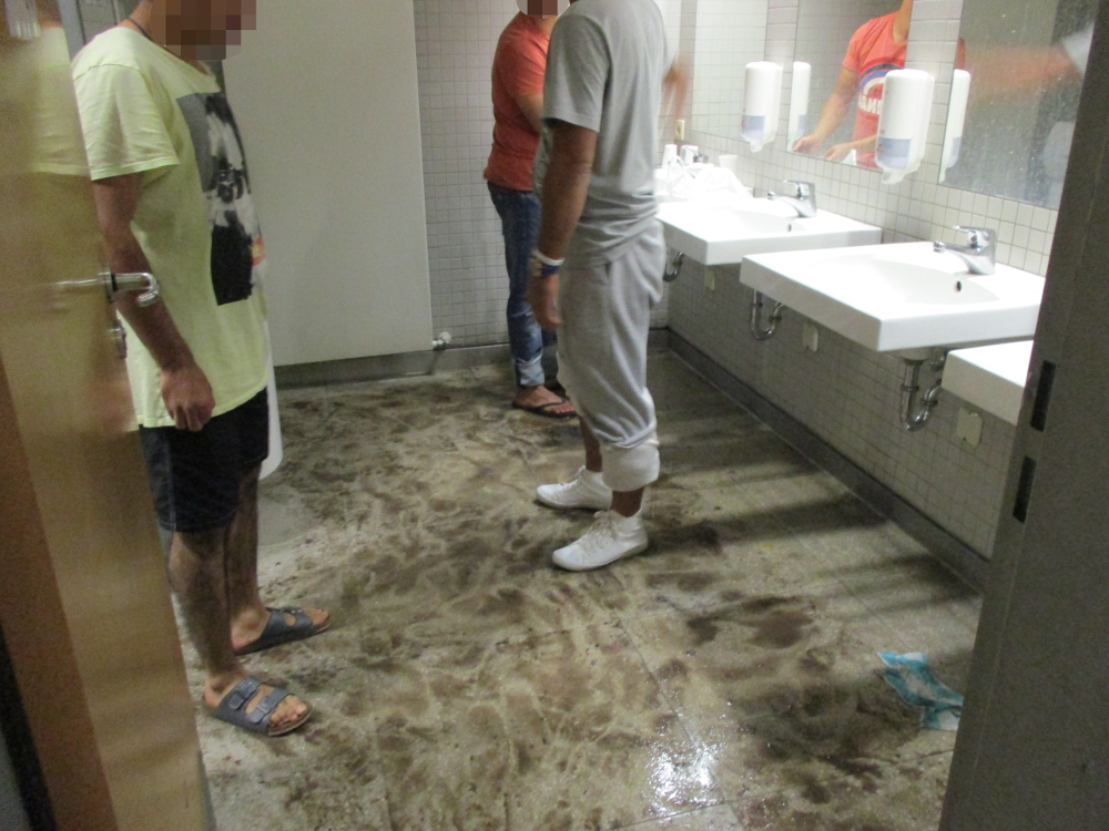 Rund 30 Bilder vom “Initiativkreis: Menschen.Würdig“ und der Initiative “Refugee-Support LE“ zeigen die Menschen in der kargen Halle. Dünne Wände trennen mehrere Liegeplätze voreinander ab. Mitunter bauen sich die derzeitigen Bewohner einen Sichtschutz mit Isolierdecken. Ebenfalls sind verdreckte Sanitäranlagen zu sehen und knapp bemessene Mahlzeiten in Aluminiumassietten. Nach Angaben der Gruppen und einem Video, in dem ein vermutlicher Bewohner in der Einrichtung die Probleme schildert, soll es kein warmes Wasser geben und nur unzureichende Waschmöglichkeiten.