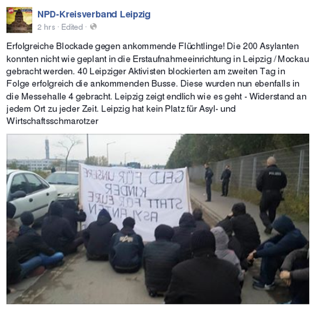Erst am Freitag wetterte der NPD-Kreisverband Leipzig auf Facebook über neu entstehende Asylunterkünfte, insbesondere in Leipzig. Unter dem Label #UnserLand hatten man am 8. Oktober Bilder publiziert von mehreren Parteimitgliedern, mit verschiedenen Botschaften. Der bisher einzige Stadtrat der rechts-radikalen Partei, Enrico Böhm, posierte dabei mit der Forderung „Volkstod Stoppen!“