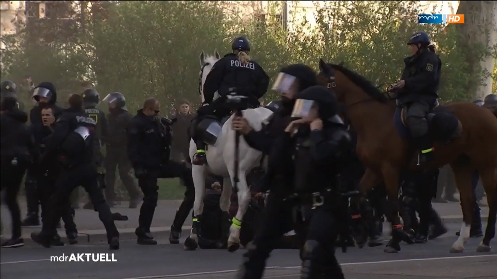 20. April 2015: Ein Beamter, welcher an der mitgeführten Kamera erkennbar polizeiliche Aufzeichnungen vom Demonstrationsgeschehen anfertigen soll, tritt mindestens einmal im Beisein von weiteren Beamten zu Pferd und zu Fuß auf einen Menschen ein, welcher in einer Sitzblockade ohne Gegenwehr am Boden kauert. Der MDR zeichnet das Geschehen auf und strahlt ein Video darüber online aus. Zur Ahndung des Verhaltens des Beamten hat sich die Polizeidirektion Leipzig bis heute nicht geäußert, der Beitrag des MDR ist aus dem Netz verschwunden.