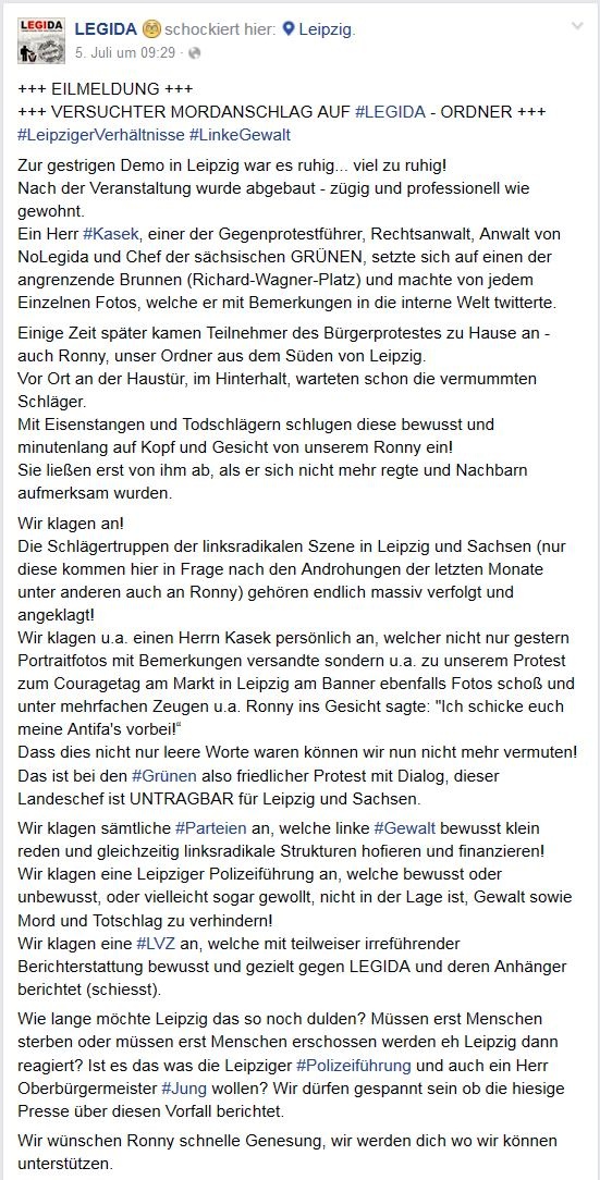 Es ging tagelang, es war übel und Legida hatte seinen „Spaß“ daran. Nachdem am Abend des 4. Juli 2016 im Anschluss an die Legida-Demonstration der Ordner Ronny U. an seinem Wohnort in Großdeuben brutal angegriffen worden war, drehten am Tag darauf die Facebookbetreuer des Legida e.V. auf Vereinsseite im Netzwerk so richtig auf. Von einer Mitschuld Jürgen Kaseks am Angriff auf den 39-Jährigen war die Rede, er solle die Schläger gar geschickt und zu diesem Zweck Bilder von Legida-Teilnehmern ins Netz (angeblich irgendwie verdeckt bei Twitter) gestellt haben.