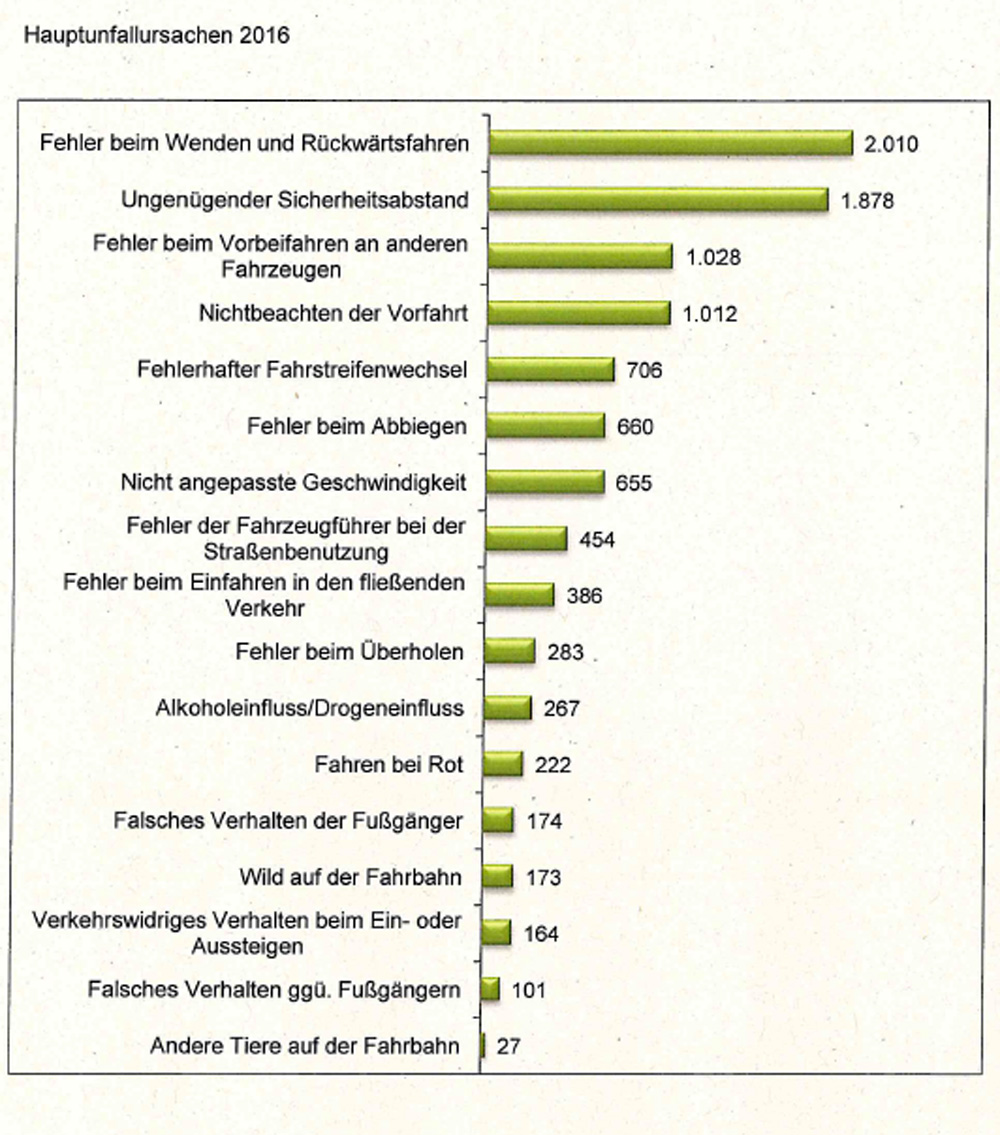 Die meisten Unfälle passieren nach wie vor zwischen motorisierten Verkehrsteilnehmern. Und sie haben ihre Ursache in den altbekannten Fehlern: Fehler beim Wenden und Rückwärtsfahren, ungenügender Sicherheitsabstand (da kracht es dann meist bei unerwarteten Bremsungen), Fehler beim Vorbeifahren und – das dann meistens mit schlechtem Ausgang – Nichtbeachten der Vorfahrt.
