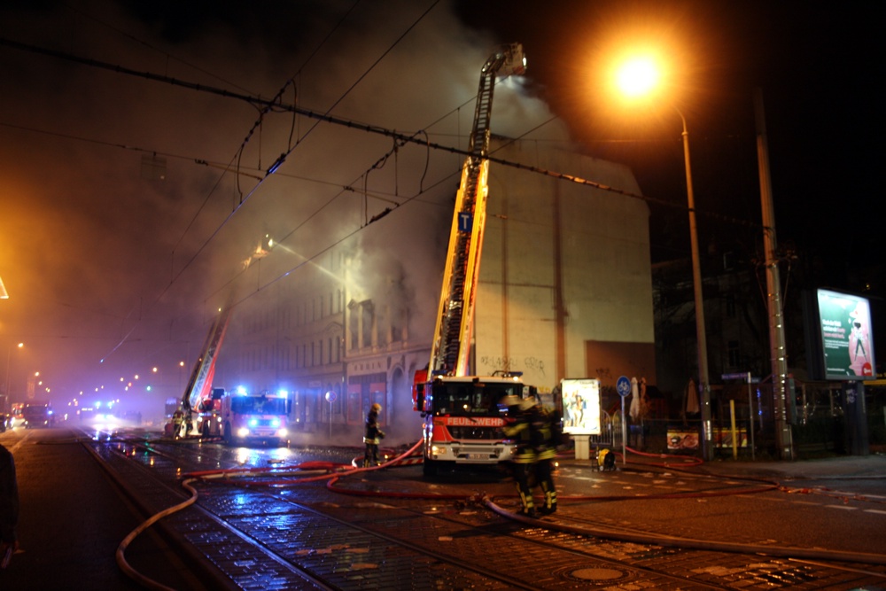 Aufgrund der fehlenden Bewohner im Gebäude dürfte es sich beim aktuellen Geschehen um den dritten Fall von Brandstiftung im Gebiet Leipzig handeln. War es im bewohnten Haus an der Eisenbahnstraße ein Kinderwagen, der in Brand gesetzt wurde, dürfte es weit schwerer sein, ein leerstehendes Haus zu entzünden. Dieses brennt in voller Ausbreitung.