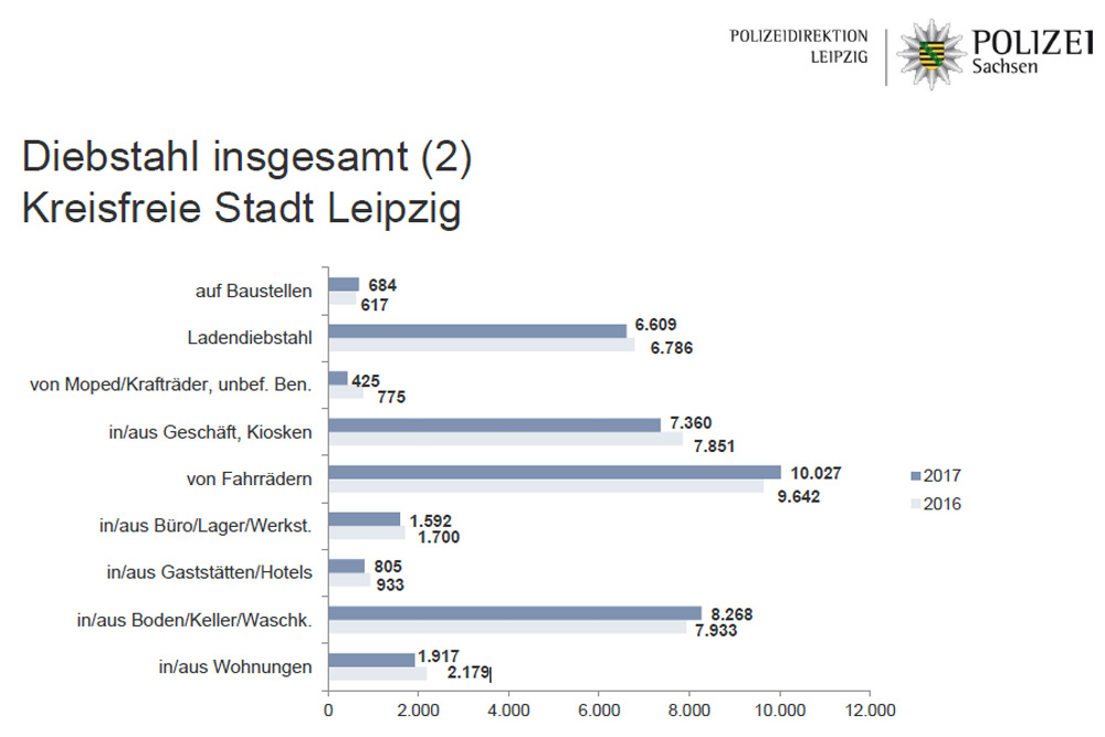 Denn die 0,5 Prozent bedeuten genau 1.600 registrierte Fälle. In der Stadt Leipzig aber ging die Zahl der von der Polizei registrierten Straftaten von 88.615 auf 79.383 zurück, fiel also um satte 10,4 Prozent.