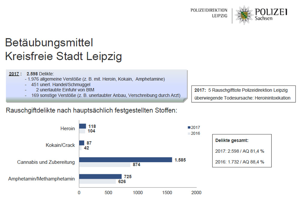 „Mit 3.315 Fällen waren im Jahr 2017 insgesamt 863 Fälle mehr als im Vorjahreszeitraum festzustellen (+35,2 Prozent). Die Zunahme entfiel maßgeblich auf die Betäubungsmittel Cannabis und Zubereitungen“, beschreibt die Leipziger Polizei das Phänomen im Direktionsbezirk. „Das verstärkte Auftreten erklärt sich unter anderem dadurch, dass Cannabis als sogenannter ‚Down‘ nach vorangegangenem Methamphetaminkonsum Verwendung findet. Insgesamt fünf Rauschgifttote und die wiederum hohen Sicherstellungsmengen verdeutlichen den polizeilichen Handlungsbedarf – zumal das Deliktsfeld der Kontrollkriminalität zuzuordnen ist und hierfür seit längerer Zeit deutlich höhere Personalressourcen erforderlich erscheinen, um dem Entstehen einer sog. offenen Szene an Schwerpunkten vorzubeugen.“