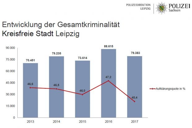 Das ist selbst für Leipzig, dem 2016 ein rasant wachsendes Kriminalitätsniveau bescheinigt wurde, ein enormer Wert. Tatsächlich fiel die Fallzahl etwa wieder auf das Niveau von 2014 zurück. Da waren es 79.235 registrierte Fälle. Immer mit Betonung auf „registrierte“. Denn die Polizei zählt nur, was auch angezeigt wurde oder was sie bei Kontrollen selbst „erwischt“ hat.