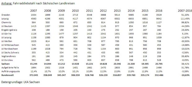 „Das ist im deutschen Vergleich zwar nicht der schlechteste Wert, zeigt aber dass der Druck auf Fahrraddiebe äußerst gering ist“, befand Konrad Krause, Geschäftsführer des ADFC Sachsen. Über 18.000 der in Sachsen 2016 gestohlenen 20.795 Fahrräder seien von der Polizei nicht gefunden worden. Bundesweit entsteht durch Fahrraddiebstahl ein jährlicher Schaden von 177 Millionen Euro.