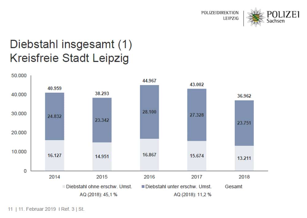 Und so betont die Polizeidirektion Leipzig denn auch: „Auch regional entwickelte sich die Eigentumskriminalität insgesamt rückläufig: Die abnehmenden Fallzahlen entfielen zum größeren Teil auf die Kreisfreie Stadt Leipzig (-6.040 Fälle), aber auch auf die Landkreise Nordsachsen (-108 Fälle) und Leipzig (-611 Fälle).“