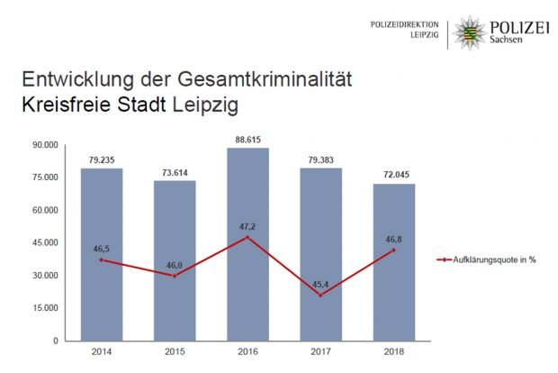 Und wie sieht es mit den Tatverdächtigen aus? – „Im Zuständigkeitsbereich der Polizeidirektion Leipzig wurden im vergangenen Jahr 30.322 Tatverdächtige und damit 460 weniger als im Jahr 2017 ermittelt. Die Anzahl nichtdeutscher Tatverdächtiger betrug 8.802 und mithin 90 (+1,0 Prozent) mehr als im Vorjahreszeitraum. Hiervon wurden 2.991 nichtdeutsche Tatverdächtige wegen ausländerrechtlicher Delikte registriert (Vorjahr: 2.948).“