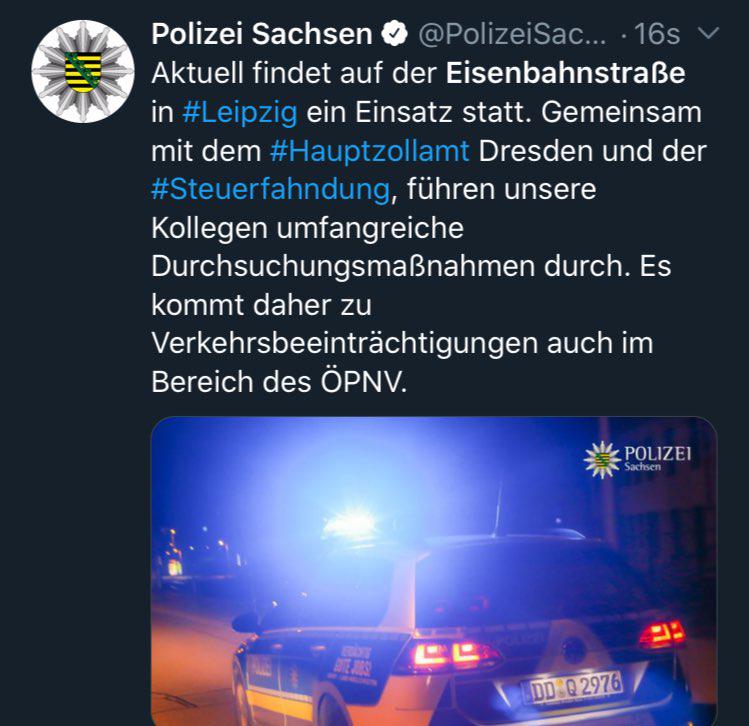 Aktuell heißt es weiter: „Zur Absicherung dieser Durchsuchungen und Kontrollen wird die Polizei notwendige Verkehrsmaßnahmen vornehmen. Auch im Bereich des ÖPNV kann es dadurch zu Umleitungen bzw. Ausfällen kommen. Der Zoll und die Polizei Sachsen wird in der Zeit der Einsatzmaßnahme aktuell über die Facebook- und Twitter Kanäle der Polizei Sachsen zu den laufenden Maßnahmen informieren.“