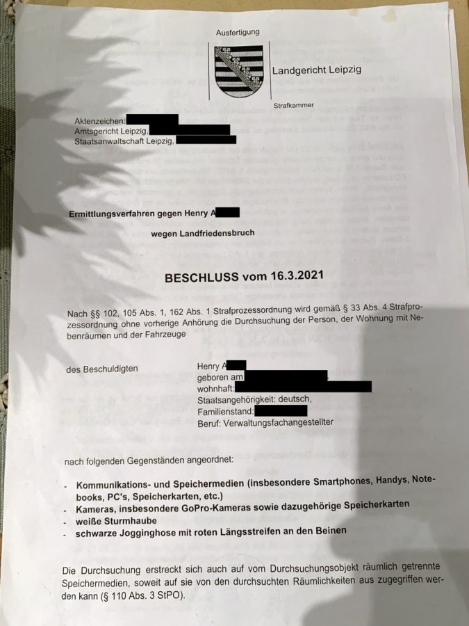 Denn jedem, der den Durchsuchungsbeschluss des Landgerichtes Leipzig für den 28. April 2021 liest, wird schnell klar, wie dünn die Vorwürfe gegen Henry A. begründet sind. DNA-Spuren? Fehlanzeige. Zeugenaussagen? Keine. Umfeldermittlungen rings um die Tatzeit 10:30 Uhr am 1. September 2019? Null.