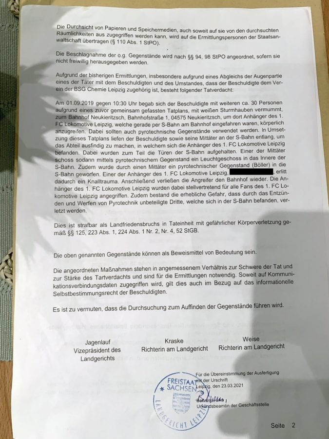 Die Unverletzbarkeit der gemeinsamen Wohnung von Henry A., seiner Partnerin und seines Kindes wurde laut Beschluss vom 16. März 2021 „aufgrund eines Abgleiches der Augenpartie eines der Täter mit dem Beschuldigten und des Umstandes, dass der Beschuldigte dem Verein der BSG Chemie Leipzig zugehörig ist“ aufgehoben. Dazu hatten die Ermittler ein Foto von Henry A. mit einem Video vom 1. September 2019 abgeglichen. Woher das Video stammt, ist unbekannt, doch offenbar sind darauf vermummte Männer bei Begehung der Taten am Bahnhof Neukieritzsch zu sehen.