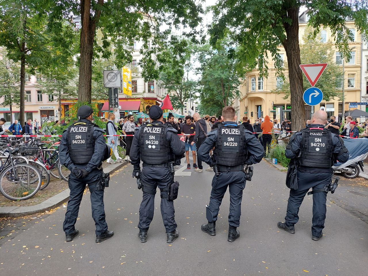 Die Demonstration an beiden Seiten der Kästnerstraße, hier also an der Karl-Liebknecht und der parallelen Bernhard-Göring-Straße ist unterdessen auf 30 bis 40 Menschen pro Kreuzung angewachsen. Im Netz wird bereits mobilisiert, vor Ort zu kommen.