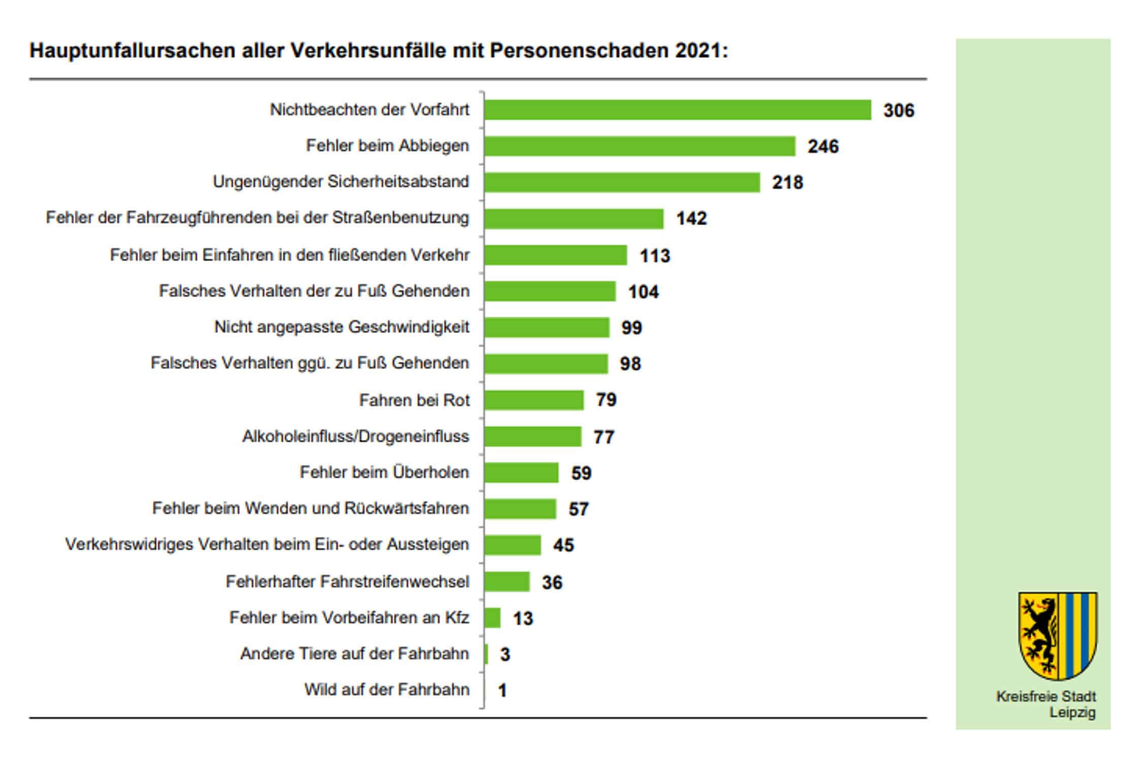 Was schlichtweg so nicht stimmt. Denn eine flächendeckende Geschwindigkeitsbegrenzung senkt nicht nur die Zahl der „geschwindigkeitsbedingten Unfälle“, sondern auch die Zahl der Unfallarten, die in Leipzig dominieren, weil sie eben auch mit hohen und überhöhten Geschwindigkeiten zu tun haben: Nichtbeachten der Vorfahrt, Fehler beim Abbiegen, ungenügender Sicherheitsabstand usw.