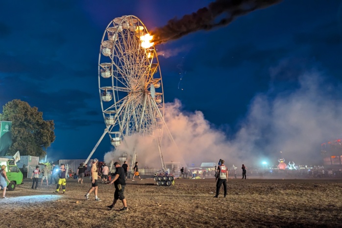 Die Veranstalter kommunizierten als Brandursache einen technischen Defekt am Riesenrad. Das Festival ist zwar unterbrochen, soll wohl aber in Kürze planmäßig mit Cro weitergehen.