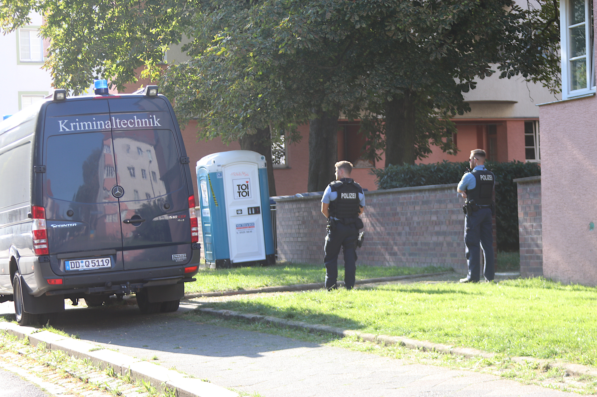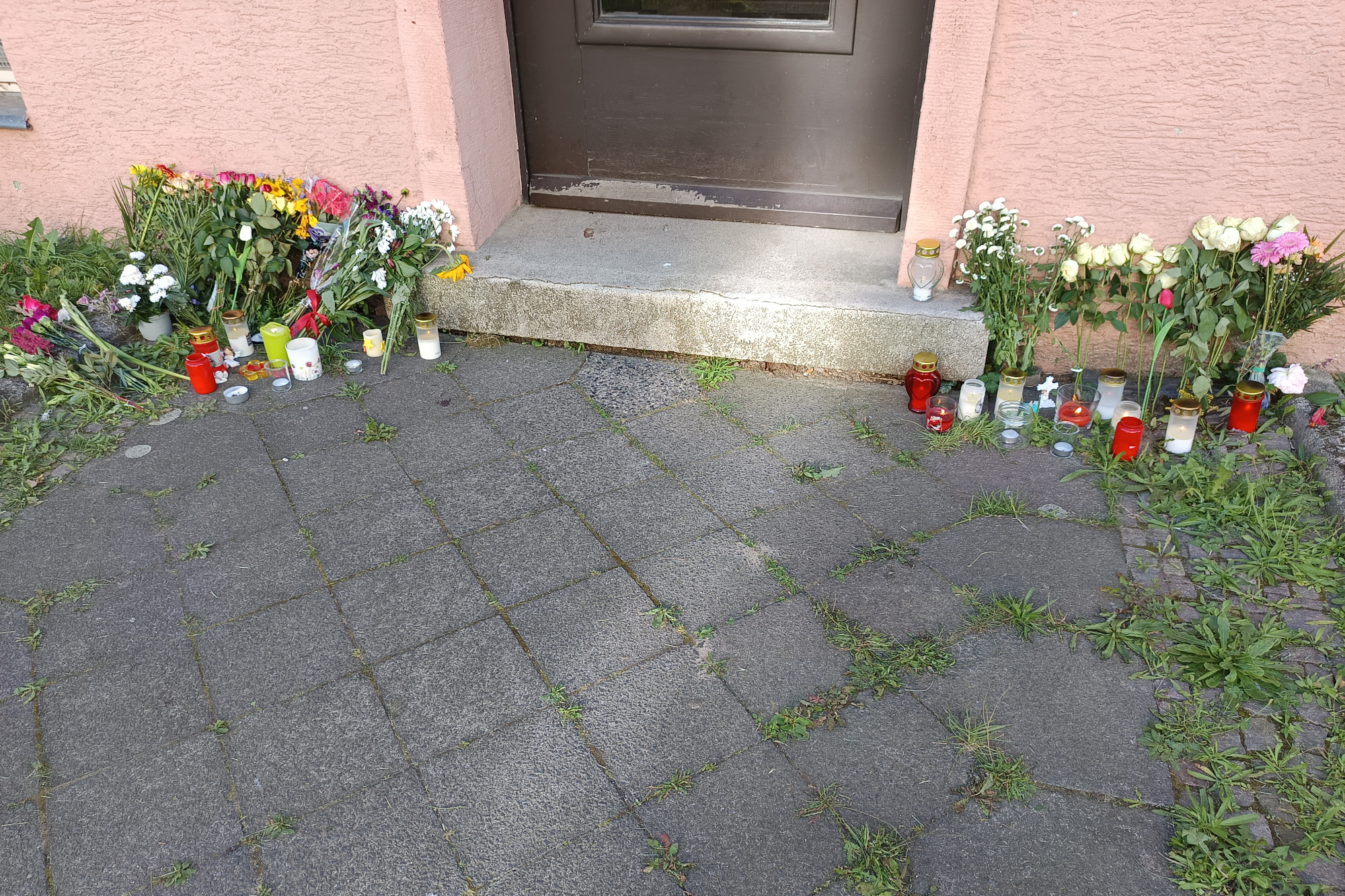 Doch die Polizisten und der auffällige Van der Kriminaltechnik sind kein Bild, das in diese scheinbare Normalität passt. Vor einem der Hauseingänge in der Fritz-Hanschmann-Straße haben Anwohnerinnen und Anwohner am gestrigen Tag Blumen und Kerzen abgelegt, um ihre Trauer und Anteilnahme auszudrücken.