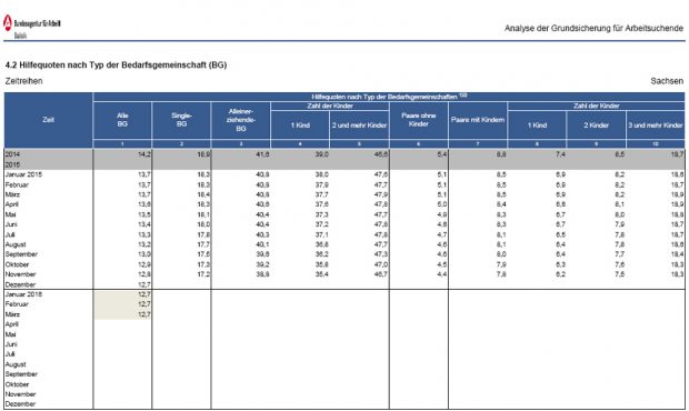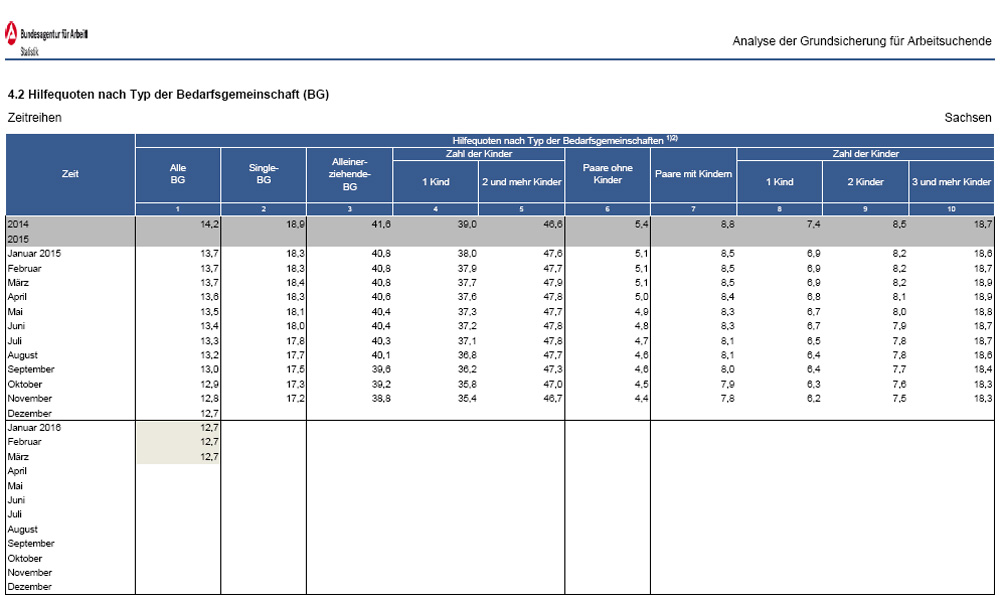 Man kann gar nicht genug aufpassen. Darauf weist uns Paul M. Schröder hin, der Mann aus dem Bremer Institut für Arbeitsmarktforschung und Jugendberufshilfe (BIAJ), der sich mit Zahlen zur Arbeitslosen-, Bevölkerungs- und Asylsuchendenstatistik so gut auskennt wie kaum ein zweiter. Diesmal geht es um die Alleinerziehenden in Sachsen. Da haben wir nicht aufgepasst und untertrieben.