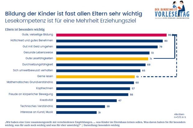 Die Studie zeige, so meint die Stiftung Lesen, dass den befragten Eltern eine gute, vielseitige Bildung ihrer Kinder besonders wichtig sei. Diese werde am häufigsten als Erziehungsziel genannt (86 Prozent), noch vor gutem Benehmen und Umgang mit Geld (83 und 79 Prozent).