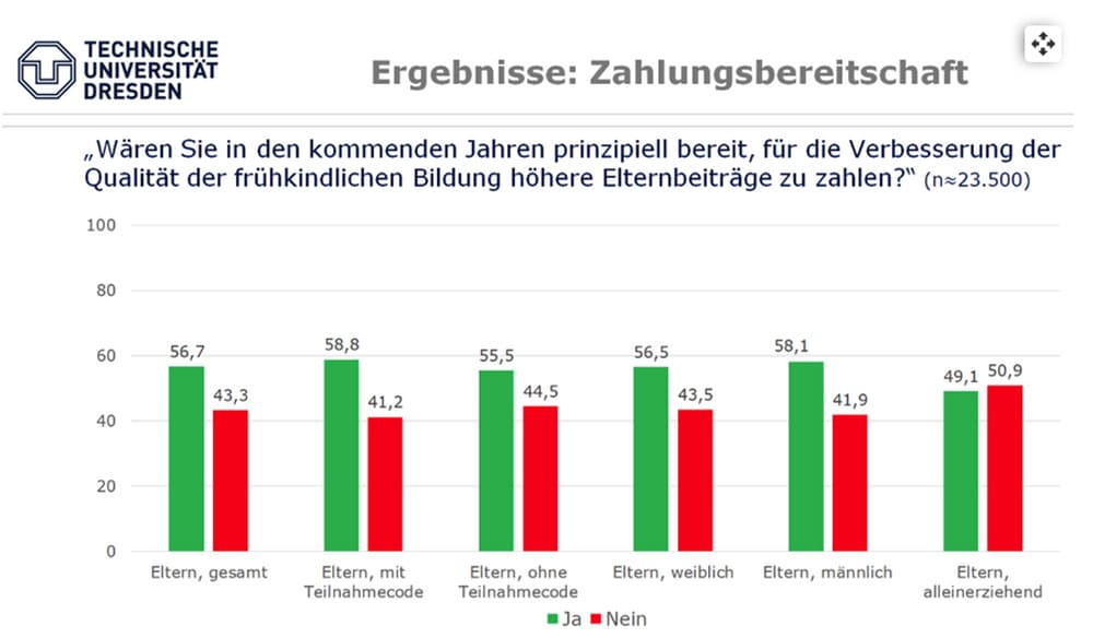„Erstaunlich klar war auch die Antwort auf die Frage, was für Eltern wichtiger ist: die Qualität der frühkindlichen Bildung oder die Absenkung der Elternbeiträge. Nur 5,7 % der Eltern bevorzugen eine Absenkung. Das zeigt, wie wichtig sächsischen Eltern die Qualität in der frühkindlichen Bildung ist. Andererseits ist ihnen auch bewusst, dass es diese nicht zum Nulltarif geben kann“, meint Schreiber. „Das Ergebnis bestätigt uns außerdem in unserer Politik, die schon heute eine finanzielle Entlastung für diejenigen bringt, die diese Beiträge nur schwer leisten können. Wir unterstützen gezielt Familien mit mehreren Kindern, sozial Schwache sowie Alleinerziehende, deren Kosten ganz oder teilweise von den Kommunen übernommen werden.“