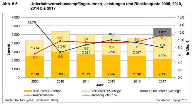 Da sind es dann eher die lokalen Gesamtausgaben zum Unterhaltsvorschuss, die darauf hindeuten, dass Leipzig spürbar mehr Fälle an notwendigem Unterhaltsvorschuss hat als etwa Dresden. Denn während Leipzig 2017 immerhin 11,1 Millionen Euro an Unterhaltsvorschuss zahlte, waren es in Dresden 9,6 Millionen und in Chemnitz 6,1 Millionen.