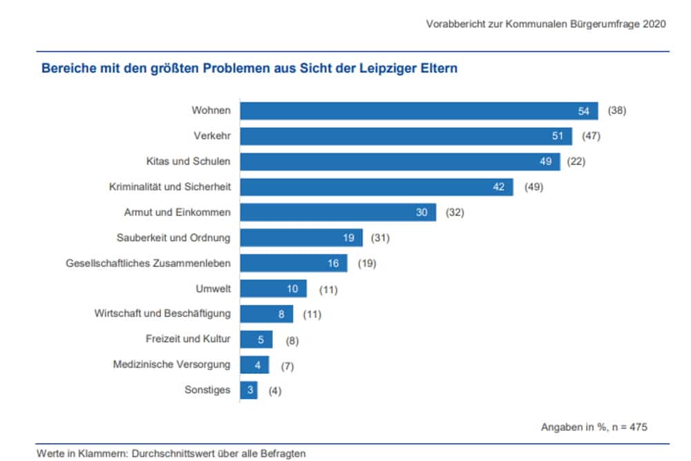 Oder um den Kommentar aus dem Kurzbericht zur „Kommunalen Bürgerumfrage 2020“ zu zitieren: „Im Bereich Wohnen sieht mehr als die Hälfte der Leipziger Eltern (54 %) große kommunale Probleme. Damit liegen sie noch um +16 Prozentpunkte über der Einschätzung der gesamten Leipziger Stadtbevölkerung.“