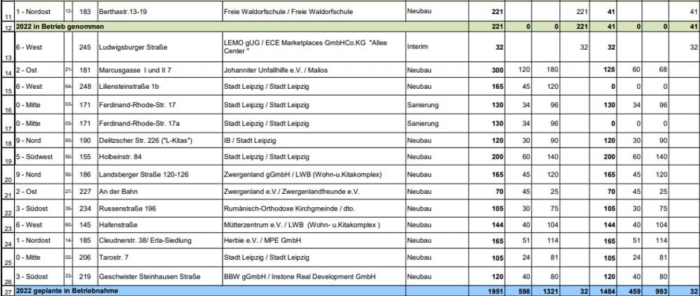 Wie stark die Zahlen der zu betreuenden Kinder gestiegen sind, zeigt die Aussage der Stadt, die im Jahr 2022 für Kinder bis zum Schuleintritt mit einem Bedarf von insgesamt 33.297 Plätzen rechnet. Für Hortkinder werden mit Schuljahresbeginn 2022/23 voraussichtlich 21.330 Plätze benötigt.
