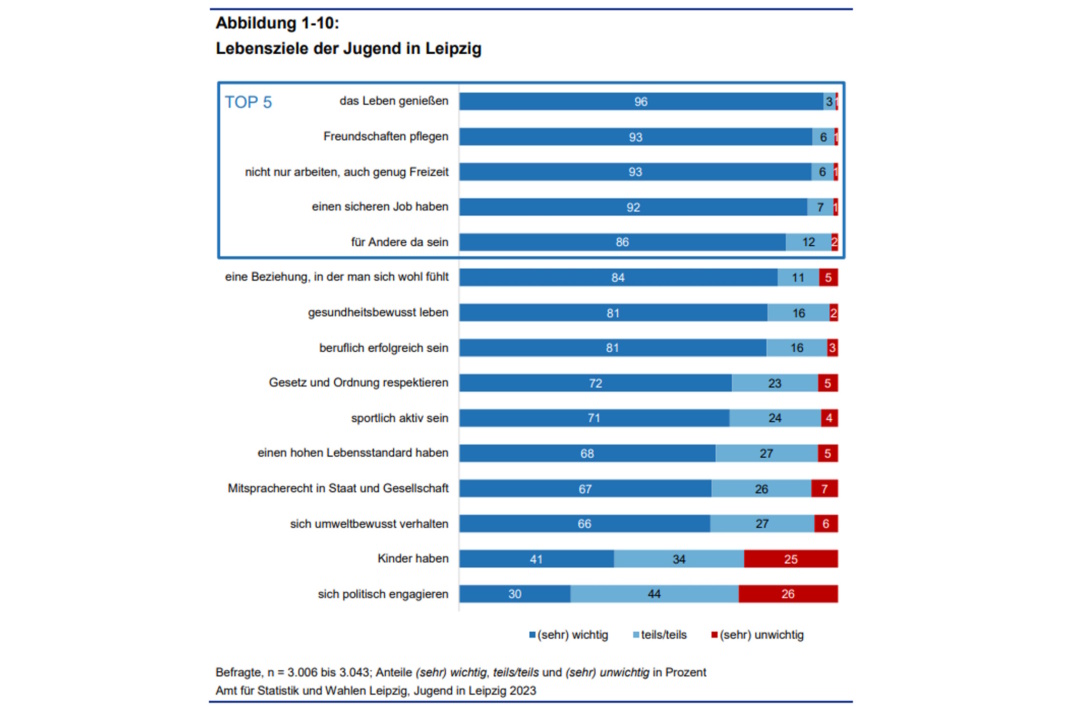 Dass die Jugendlichen das Leben genießen wollen, ist nicht neu. Das steht bei jeder Befragung ganz oben und wird von den Autor/-innen des Berichts auch als positiv bewertet. Die jungen Leute, die da derzeit noch auf Leipziger Schulbänken sitzen, sind sehr sozial eingestellt.