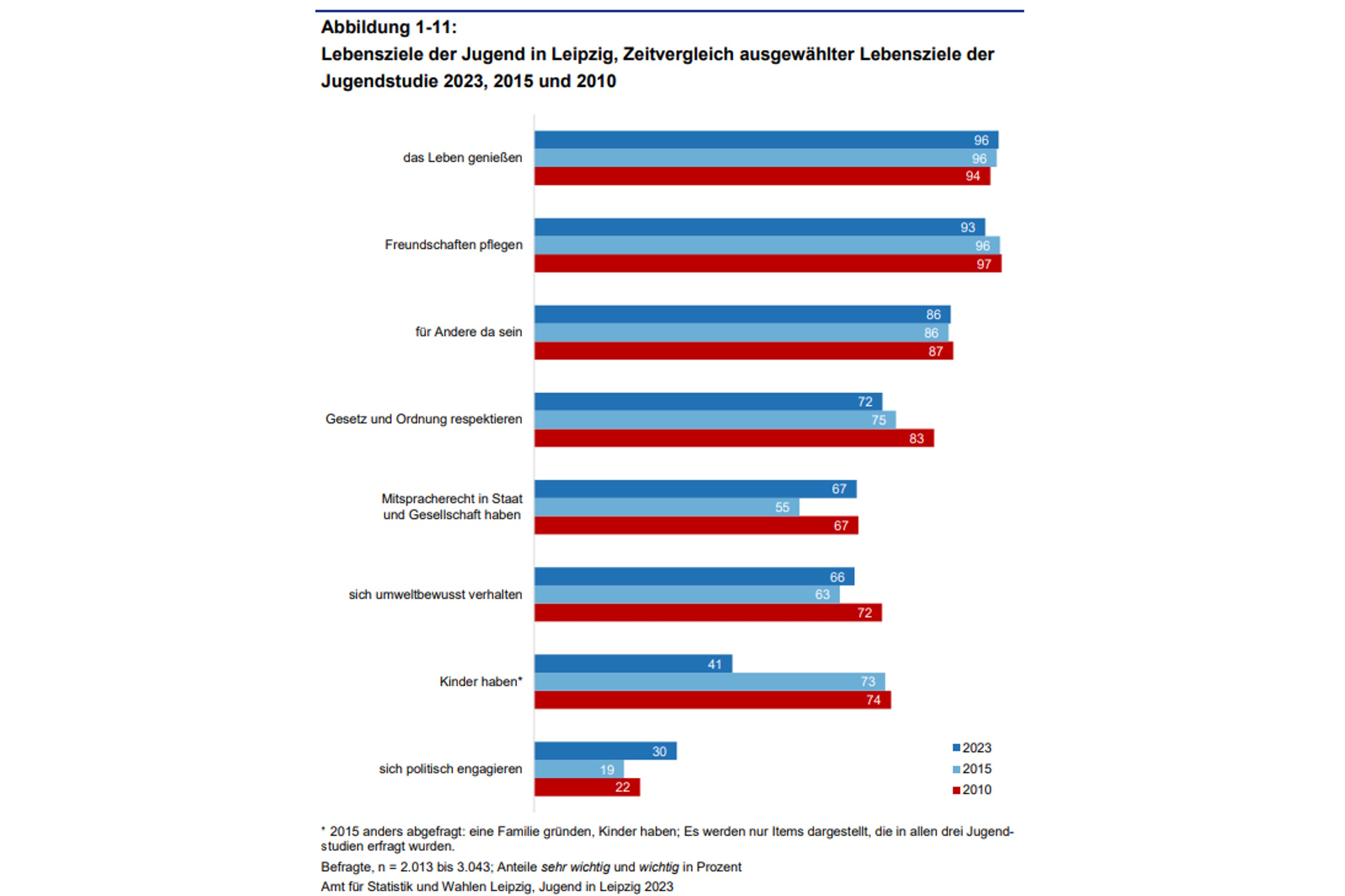 Und ein bisschen erschrecken durfte man schon, als die Stadt dann in Auswertung der Studie „Jugend in Leipzig“ meldete: „Das Lebensziel, später einmal selbst Kinder haben zu wollen, ist bei den Befragten enorm zurückgegangen: Nur noch 41 Prozent der Schülerinnen und Schüler erachten dies als wichtig an – ein Rückgang um 33 Prozentpunkte im Vergleich zu 2010.“