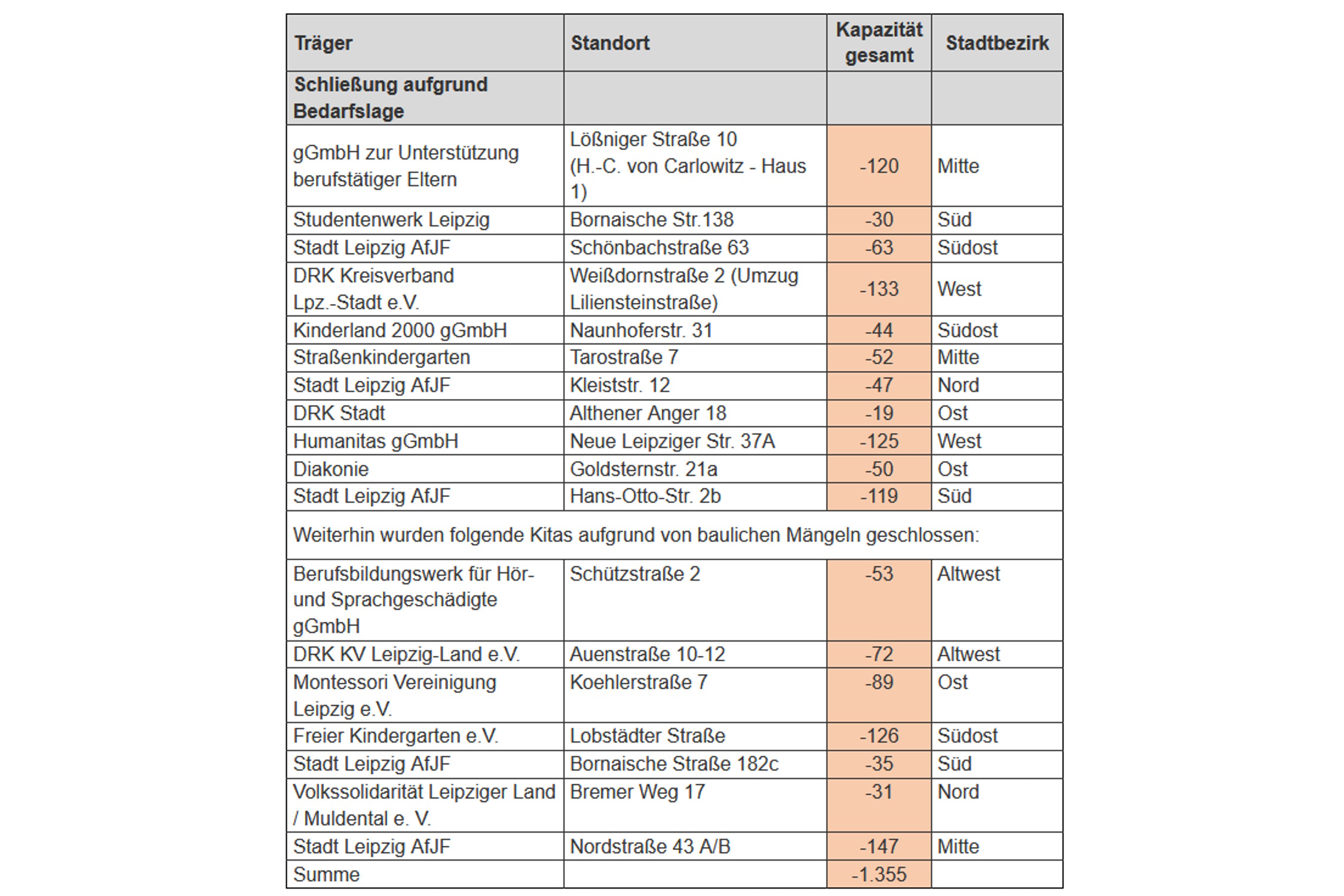 Die Kindertagesstätten, die Leipzig schon geschlossen hat. Grafik: Stadt Leipzig