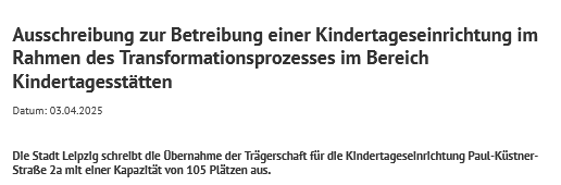 Auf der Webseite der Stadt Leipzig findet sich seit April 2025 eine Ausschreibung der Trägerschaft für die Kita. Also fragten wir bei der Stadt nach.