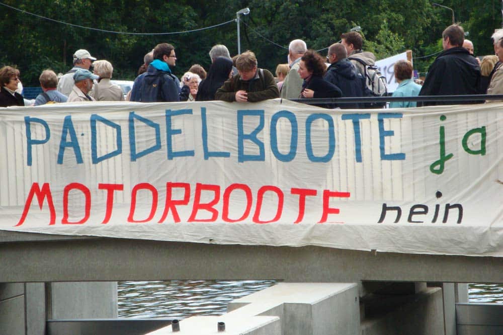 Eine Frage, die Oberbürgermeister Burkhard Jung ob des himmelblauen Tages, der guten Laune sowie der vielen angereisten mehr oder weniger prominenten Gäste nicht so recht in den Kram passen wollte. Folglich druckste er, angesprochen auf die fehlende Barrierefreiheit, auch mehr oder weniger verlegen herum: “Das müssen wir natürlich auch in der kommenden Zeit bewältigen. Das sind Probleme, die wir in Angriff nehmen müssen. Ich verstehe auch die Ängste der Menschen, die gegen motorisierte Boote sind. Da muss man sorgfältig abwägen.” Muss man wohl dann so sagen, wenn man sich des Politikersprechs befleißigt. Und so sagten an diesem Tag alle schöne Worte für eine an sich sehr schöne Sache. Und wer noch weiß, wie es in und um Leipzig damals so vor rund 20 Jahren ausgesehen hat, der reibt sich heute noch die Augen.