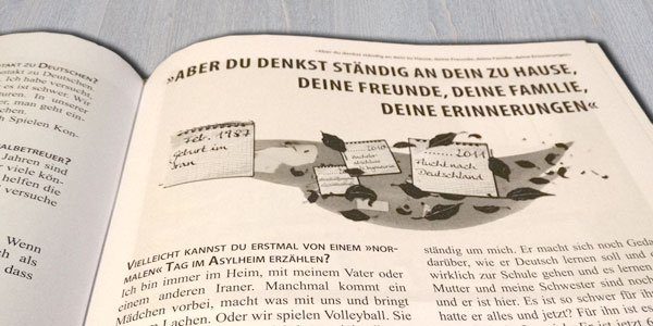 Ich bin immer im Heim, mit meinem Vater oder einem anderen Iraner. Manchmal kommt ein Mädchen vorbei, macht was mit uns und bringt uns zum Lachen. Oder wir spielen Volleyball. Sie ist mir sehr wichtig. Und ich lerne viel selbständig, versuche Deutsch zu lernen. Neben meinen Hausaufgaben, lese ich immer parallel noch ein anderes Buch. Und an Weihnachten war ich letztes Jahr in Mönchengladbach bei meinem Onkel.