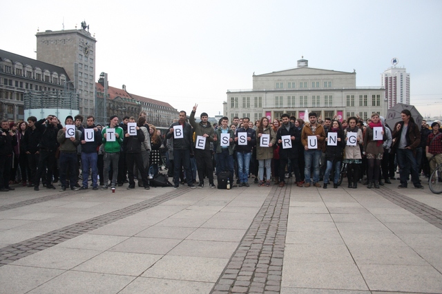 Nach einer dreiviertel Stunde wurde die Veranstaltung auf dem Augustusplatz beendet und dem Studenten Gute Besserung durch einen Schriftzug aus hochgehaltenen einzelnen Buchstaben gewünscht.