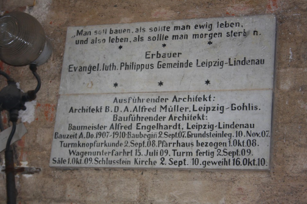 Zunächst geht es recht bequem los. Breite Stufen führen nach oben. Eine Inschrift verrät einige Daten über die Kirche und den Turm. Danach war der ausführende Architekt Alfred Müller. Er kam aus Leipzig, Gohlis.  Bauführender Architekt war Alfred Engelhardt aus Lindenau. 1907 bis 1910 wurde gebaut, der Grundstein wurde am 10. November 1907 gelegt, das Pfarrhaus am 1. Oktober 1908 bezogen und fertig war der Turm dann am 2. September 1909. Ein Jahr später wurde die Kirche eingeweiht: 16. Oktober 1910.
