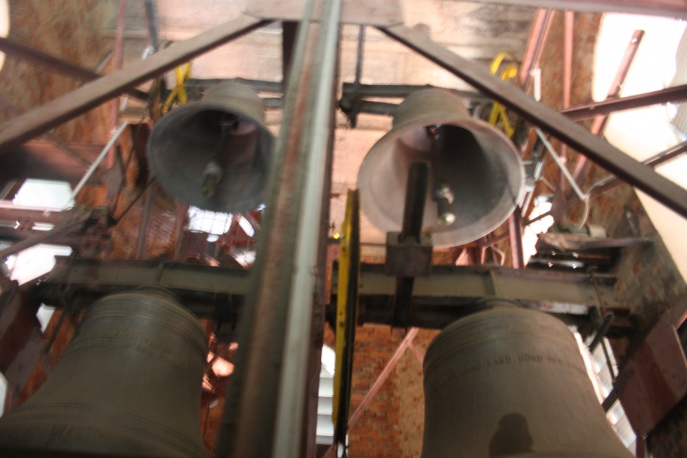 Vier Glocken hängen im Turm. Jede trägt eine Inschrift. Biblische Zitate wurden gewählt. Auf der ersten Glocke steht “Jauchzet Gott, alle Lande”. Psalm 66 wurde hier zitiert. Die zweite Inschrift kommt aus Matthäus 7,7: “Bittet, so wird euch gegeben”. Etwas länger ist der Text auf der dritten Glocke: “Wachet, stehet im Glauben, seid männlich und seid stark.” Das Pauluszitat findet sich im 1. Korintherbrief 16,3. Prophetische Worte fand man für die vierte Glocke: “O Land, Land, Land, höre des Herren Wort”. So steht es im Alten Testament beim Propheten Jeremia 22,29. Die Glocken werden hier, wie sonst auch in der Stadt, elektrisch angetrieben. Es gibt aber noch das Loch, in dem früher das Seil zum manuellen Läuten hing.