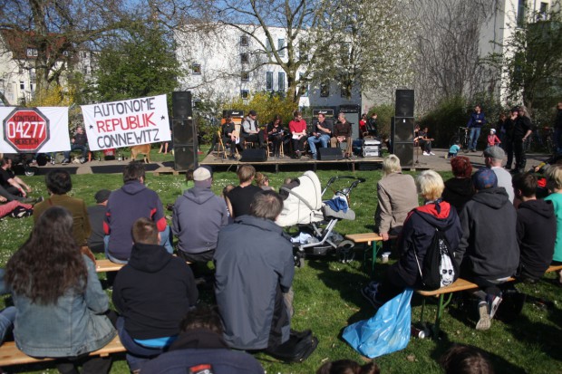 Wozu ist eine Stadt gut? Gibt es überhaupt ein Recht auf Stadt und wohin soll die städtische Entwicklung in Leipzig gehen? Alles bedeutende Fragen, über die am Sonntagnachmittag ein Podium aus verschiedenen stadtentwicklungskritischen Initiativen und Vertretern der Stadt Leipzig diskutierten. Das Gespräch fand im Rahmen des zweiten politischen Straßenfests „Kontrollbereich 04277“ im Herderpark statt.