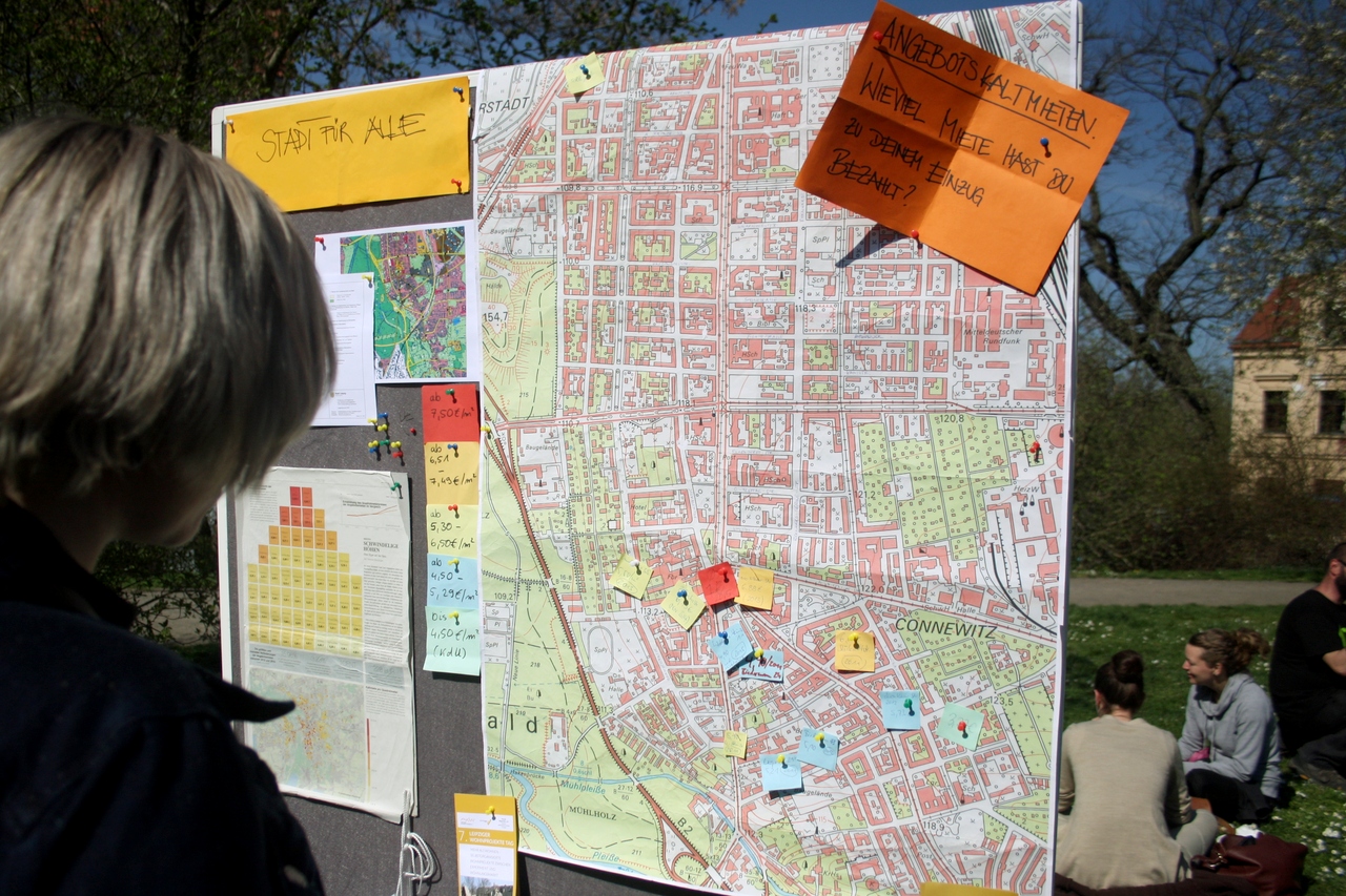 An einer Karte sammelte er für das Netzwerk einen aktuellen Überblick über die Quadratmeterpreise in Connewitz. Eine mühevolle Kleinarbeit, weil die Information über die Preise oder Käufe und Verkäufe von Häusern meist nur durch die Mieter selbst kommen.
