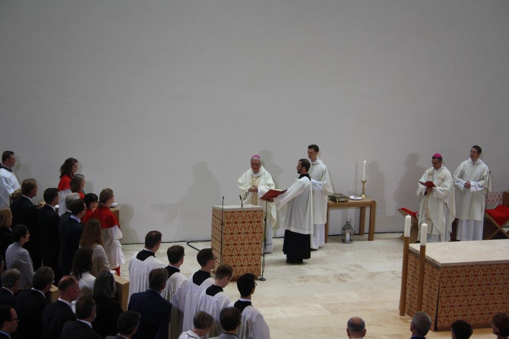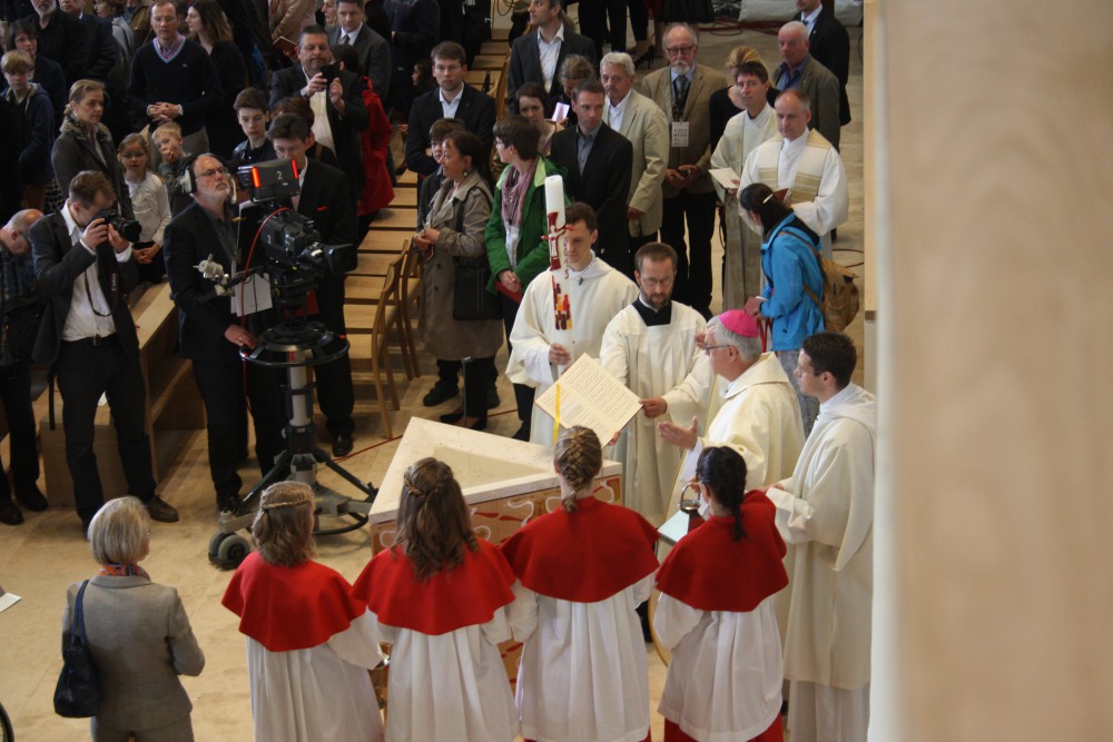 “Jetzt müssen alle raus, weil der Bischof als erstes in die Kirche einziehen wird.” Na gut, diese Idee kann umgesetzt werden, wenn nicht gerade live gesendet wird. Dann kann tatsächlich der Bischof als erster einziehen. So aber blieben natürlich die Kameramänner, Fotographen und der Chor. Irgendjemand muss ja die Bilder machen. Und wenn der Chor erst einzieht, wenn der Bischof kommt, dauert es auch zu lange. Schließlich beträgt die Sendezeit exakt zwei Stunden. Deshalb übten am Vorabend Ministranten, Liturgen und Chor schon mal in der neuen Kirche. Ergebnis der Probe war, dass der Chor weniger singen durfte. Risikofaktor war dann nur noch, wie lange die Gemeinde braucht, um Platz zu nehmen.