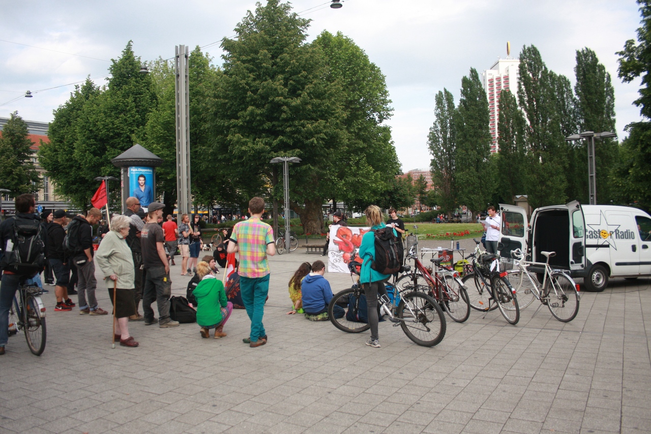 Die Verbindung zwischen Schloss Elmau und Leipzig liegt nun in einer Aktion am Freitagnachmittag begründet. Das „Anti-imperialistische Bündnis Leipzig“ mobilisiert ebenfalls gegen den Gipfel. Verschiedene anti-imperialistische Gruppierungen wie die Sozialistische Deutsche Arbeiterjugend (SDAJ), der Arbeitskreis Nahost (AKN) und Attac Leipzig beteiligten sich an der Kundgebung. Angemeldet war ursprünglich eine Demonstration vom Hauptbahnhof zum Rabet mit 50 bis 150 Teilnehmern, wie die Stadt Leipzig in einer Pressemitteilung am Donnerstag mitteilte.