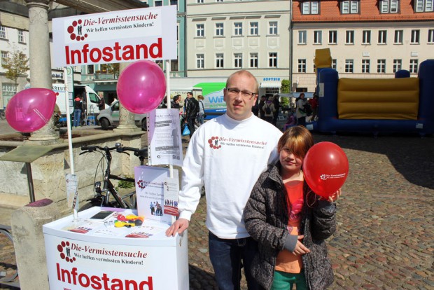 An diesem Tag werben wir auch für die Veranstaltung zum Tag der vermissten Kinder am 25.05.2015 in Berlin auf dem Pariser Platz. Wir möchten an diesem Tag den immer noch vermissten Kindern gedenken und zu 12:00 Uhr Luftballons mit angebunden Zettel mit vermissten Kindern steigen lassen. Dazu gibt es auch einen Infostand zum Informieren über unser Projekt. Ich und Heidi Stein, die ihren Sohn seit 36 Jahren vermisst, veranstalten zusammen diesen Tag. Sie hat ebenfalls einen Stand und stellt u. a. Kinder, die in der DDR vermisst wurden bzw. immer noch vermisst werden vor. Auch der Künstler und Sänger Rainer Garden tritt an diesen Tag ohne Gage auf mit seiner Musik.