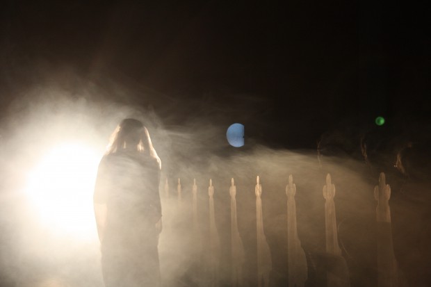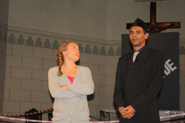 Während der Imam versucht, in bemühter Ruhe immer wieder zu erklären, wie das etwa mit dem Kopftuch zu verstehen ist und warum der Kontext im Koran wichtig ist, gibt es noch den deutschen Konvertiten. Der ist etwas impulsiver: “Das Buch ist der Hammer”, freut er sich über ein Exemplar, dass ihm geschenkt wurde: “Da habe ich gleich die Bibel, die mir meine Oma geschenkt hat, am Strand vergraben.” Zum Höhepunkt des Stückes wird die Rückblende auf die erste Begegnung des Konvertiten mit seiner Frau, die er über ein muslimisches Dating-Portal gefunden hat. Unter Orgelmusik und mit viel Nebel schreitet sie unter einem weißen Schleier durch das Kirchenschiff.