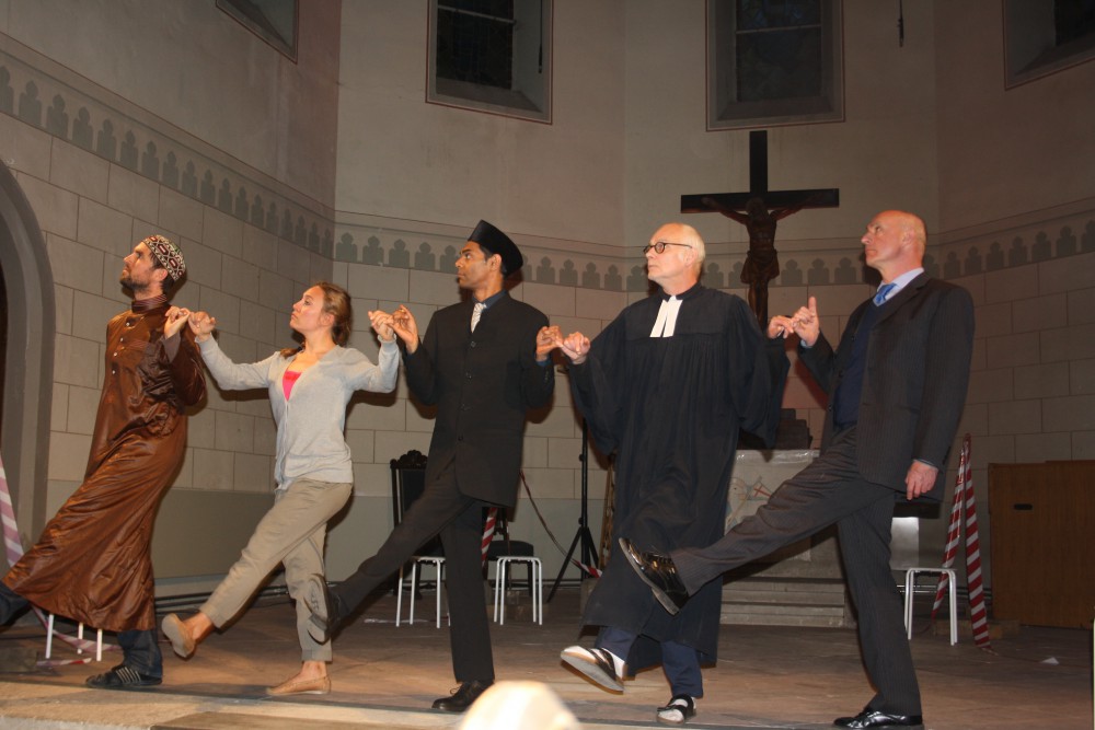 An dieser Stelle spätestens wird dann auch die Differenz zwischen Berlin damals und Leipzig jetzt deutlich. Die Friedenskirche, in der das Stück hier spielt, gehört zur Michaelis-Friedenskirch-Gemeinde. Die Michaeliskirche diente bereits als Diskussionsforum, regelmäßige interreligiöse Gespräche arbeiten sich an unterschiedlichen Themen kontrovers ab, ohne dass es zum Bruch kommt. Die Tonart des Konflikts ist also anders.
