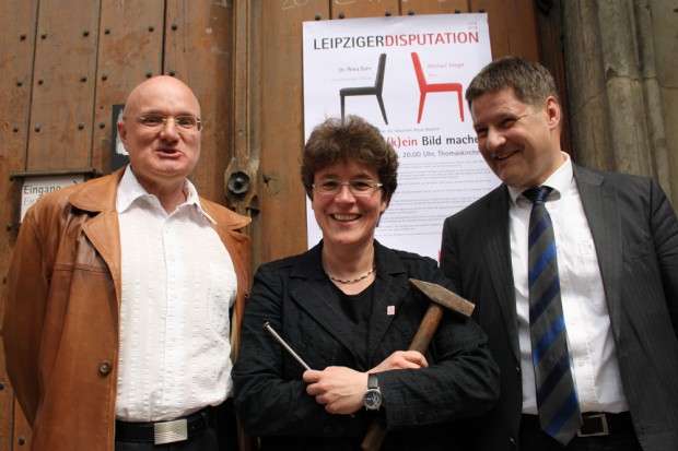 Was tun, fragten sich die Organisatoren der Veranstaltung, die sich regelrecht zur Leipziger Attraktion gemausert hat? “Diesmal haben wir die Thesen selbst vorgegeben”, sagt Prof. Dr. Ulrich Brieler vom Referat Wissenspolitik der Stadt Leipzig, der auch das Grundmaterial für die Thesen mitgeliefert hat. Zu dritt hat man dann weiter gefeilt: Stadt, Thomaskirche und Uni Leipzig, praktisch dieselben Partner wie 1517. Nur dass die Uni-Professoren 1517 eigentlich kniffen, als es darum ging, einen ordentlichen Herausforderer für diesen Professor Luther aus Wittenberg zu stellen. Da musste extra der Dr. Eck kommen, der zuvor schon heftig gewettert hatte gegen diesen Umstürzer.