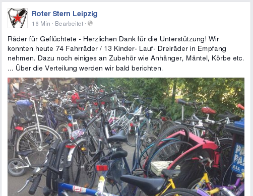 Der Rote Stern ist für seine antirassistische Arbeit bekannt. Am Samstagnachmittag veranstaltete der Fußballverein eine Sammlung von Fahrrädern für Flüchtlinge in Leipzig und erntete eine unerwartet große Beteiligung. Auch aus anderen Städten wurde nach Möglichkeiten zur Teilnahme gefragt. Ein Modell, das vielleicht bald Schule macht.