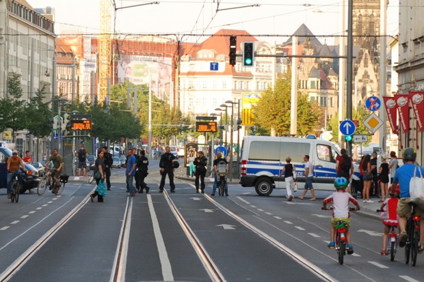 Auf der Elsterstraße ist dicht, auf der Jahnallee auch. Noch fehlt im Waldstraßenviertel jede Spur von Legida & Pegida. Neue Bilder sollen gleich kommen …