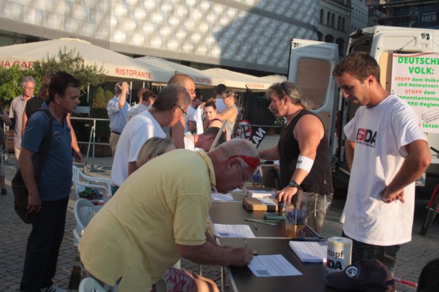 Markus Johnke hat einen kurzen Zwischenstand zum Thema “Raus aus der GEZ” mitgebracht. 13.000 Unterschriften habe man, 40.000 werden gebraucht im ersten Schritt zum Volksentscheid. Sonst ist es heute seitens Johnke durchaus vernünftig, wenn er auf die politischen Probleme auf der Welt verweist und diese als Teil der Flüchtlingsbewegungen nach Deutschland und Europa benennt. So wünsche er sich, dass Legida-Teilnehmer nicht vor Asylbewerberheimen demonstrieren sollten. Haben sie zwar schon massenhaft, aber vielleicht hört ja irgendwann mal jemand auf Johnke?